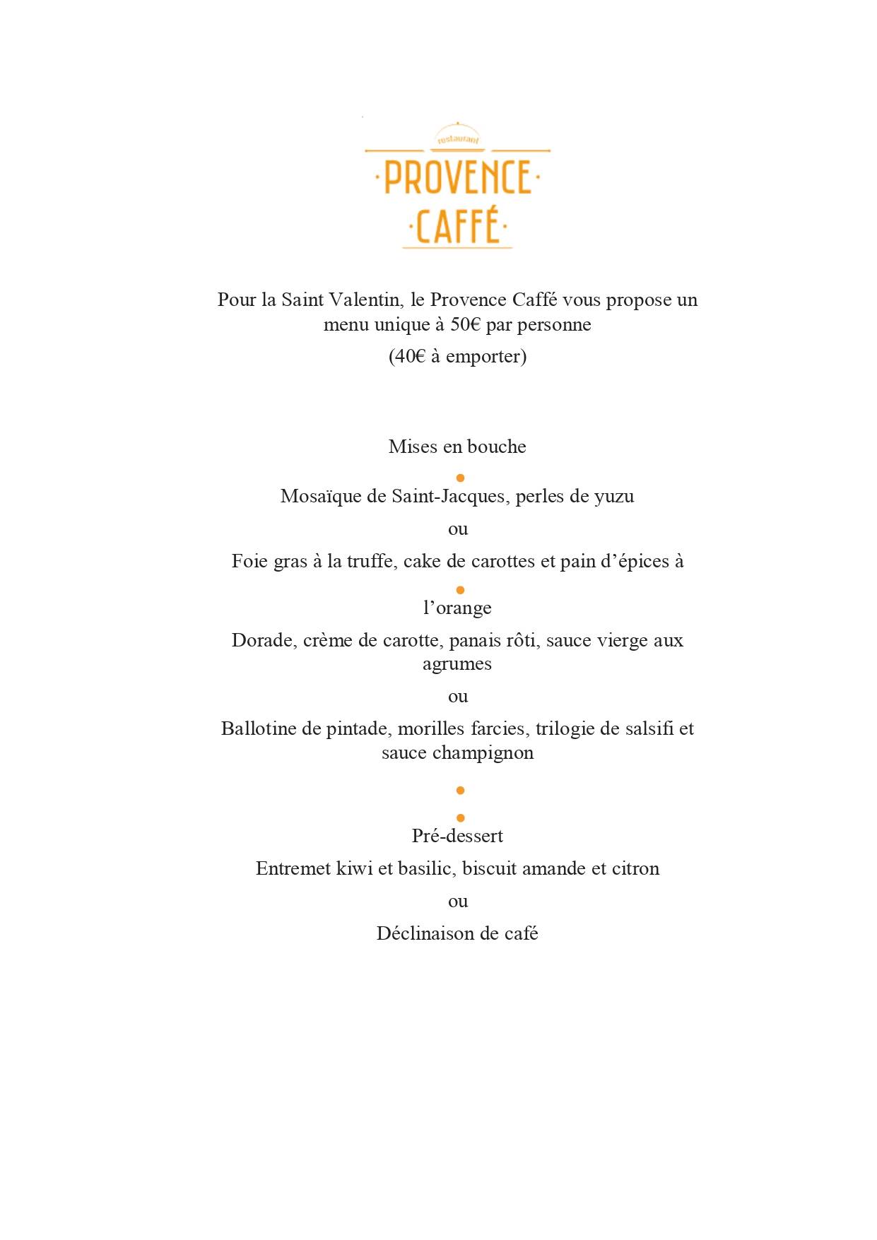 À l’occasion de la Saint-Valentin, Provence Caffé vous propose un menu unique, spécialement imaginé pour célébrer l’amour autour d’une cuisine gourmande et raffinée.